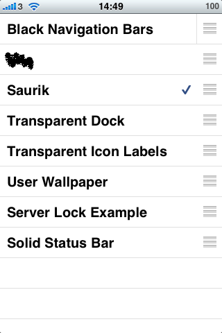 使用Winterboard方法,見圖點一下WinterBoard,就會見到下面圖樣。有多個不同的主題名稱,只要你只一下就會出現"挑",多按一下就會消失,如圖,我選了原版WinterBoard的主題,它有兩個背景,會不時換轉。 |