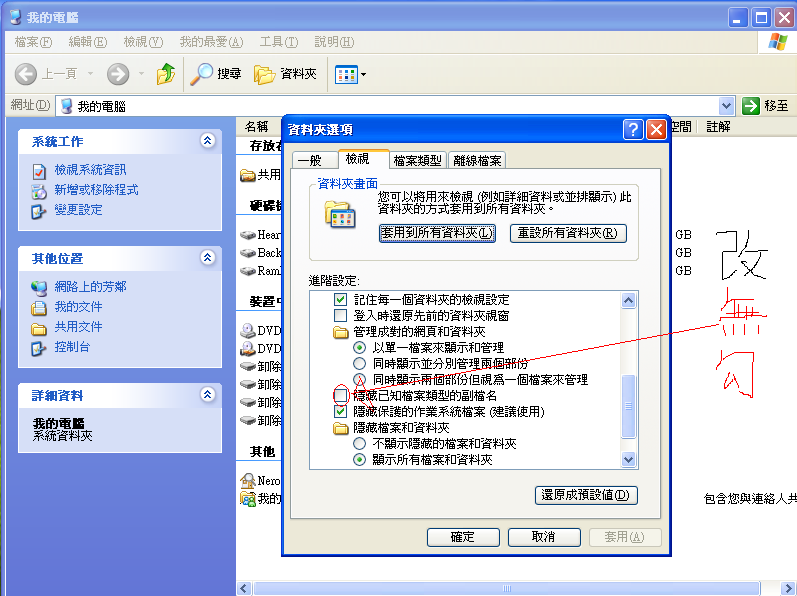 入資料夾選項再睇檢視,睇下圖取消隱藏副檔名。