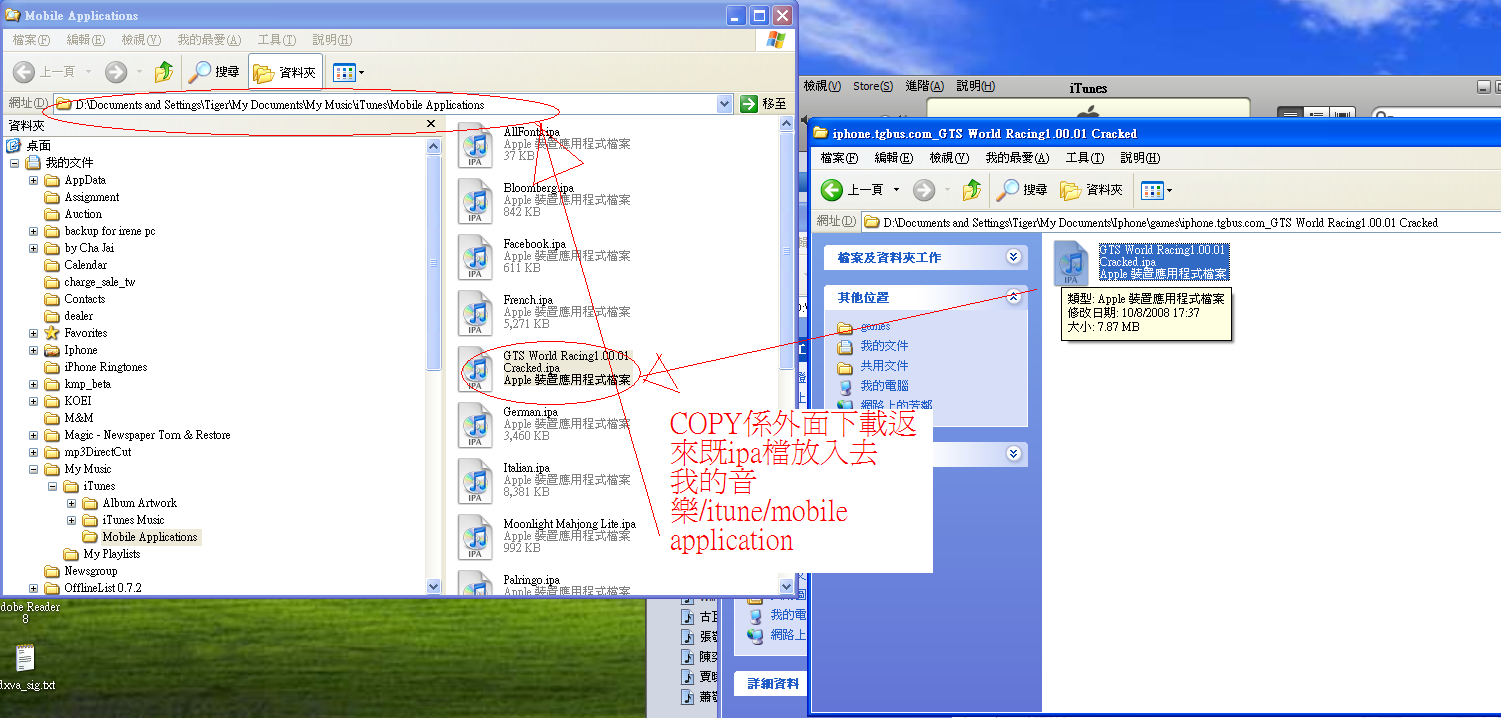 ok,跟住將你好似下圖咁將個下載返來既ipa放入我的音樂\iTunes\Mobile Applications,