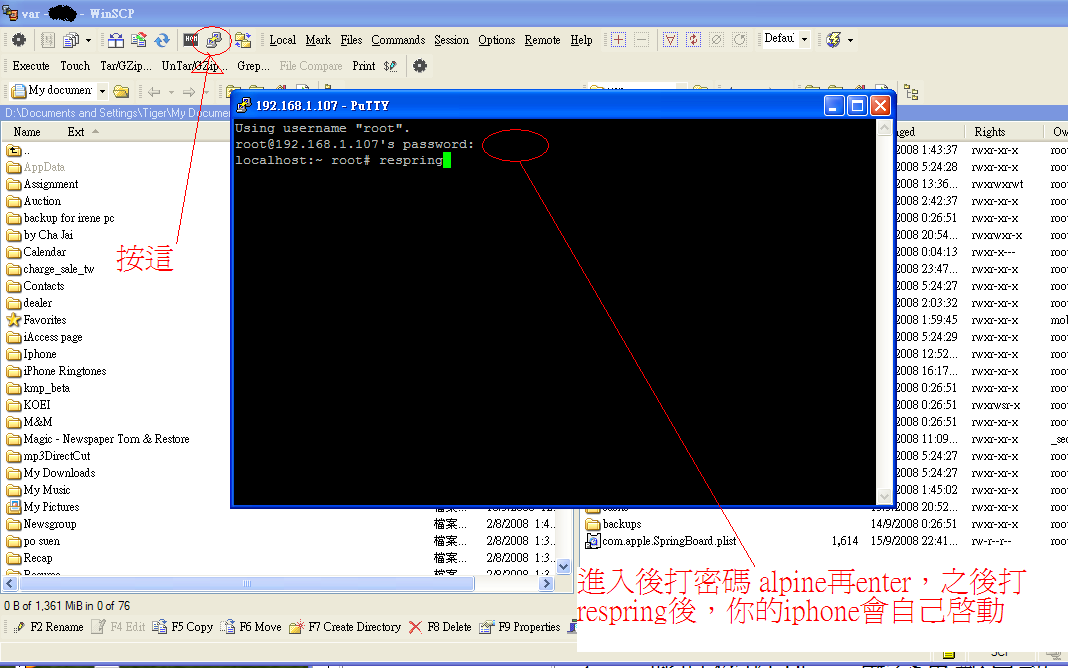 | 安装后,使用winscp进入iPhone,在左角附近有一个按钮叫"Putty",点选后会多出一个dos窗口,打入密码,alpine,之后enter,之后再打respring,之后enter,此时你的iPhone就会重新启动,那你之前放入的app就可以在iphone显示了。 | ||